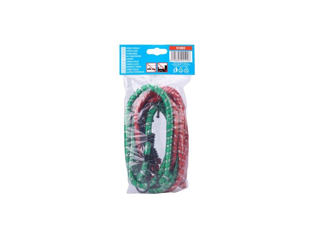 Elastické gumové popruhy, opletené polyesterem a zakončené oboustranně háky z ocelových poplastovaných drátů k uchycování zavazadel.Dodatočné parametre