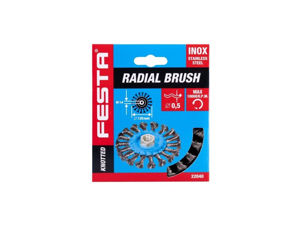 Rotační kartáč - radiální, provedení : COPY - patentovaný drát nerezová ocel 0,5 mm - copy, se ani při extrémním zatížení nerozplétají, kartáče FESTA zaručují kvalitní použité materiály i zpracování, průměr 125 mm, závit M 14 x 2 mm, pozinkované tělo kartáče, počet drátů : 1320, délka drátu : 27 mm, max. přípustné otáčky : 10000 1/min, použití : odstranění barvy, rzi, otřepů, zbytků po svařovení, strusky, zdrsňování, čištění kovoých součástí, balení papírový box s eurootvorem. <ul style="color: red"> <li type="square"><a href="https://www.youtube.com/watch?v=Gu1sL6isc6E">Instruktážní video</a></li> </ul>Dodatočné parametre