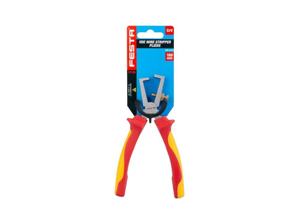 Kleště VDE odizolovávací 160 mm FESTA mají certifikaci elektro VDE 1000 V, IEC/EN 60900-2004, kombinace polypropylenu a pryže na ergonomicky tvarovaných ručkách zaručuje výborné antiskluzové vlastnosti a dobrou odolnost vůči mazadlům a chemikáliím. Uchopovací čelisti obzvláště odolné proti opotřebení, chromvanadová vysoce výkonná ocel. Hmotnost 0,283 kg.Dodatočné parametre