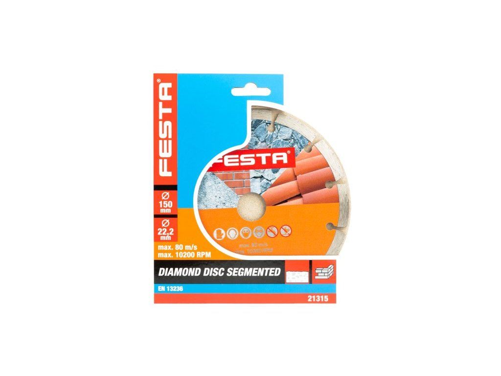 Profesionální diamantový kotouč FESTA, provedení : SEGMENTOVÝ, kvalitní materiály i zpracování - vysoce pevné uchycení diamantových segmentů k nosnému disku kotouče, vysoký obsah diamantového prachu v segmentech, použití : pro suché řezání betonu, cihel, zdiva, kamene, ... , balení : blistr s eurootvorem, rozměry : uvedeny v názvu výrobku.Dodatočné parametre