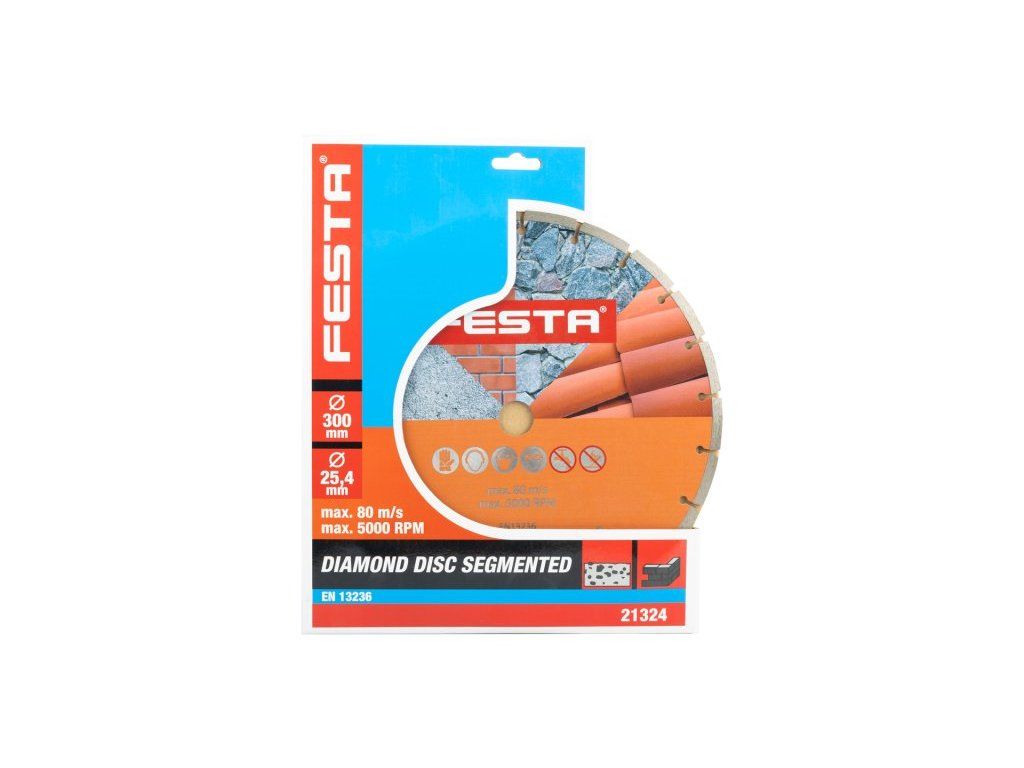 Profesionální diamantový kotouč FESTA, provedení : SEGMENTOVÝ, kvalitní materiály i zpracování - vysoce pevné uchycení diamantových segmentů k nosnému disku kotouče, vysoký obsah diamantového prachu v segmentech, použití : pro suché řezání betonu, cihel, zdiva, kamene, ... , balení : blistr s eurootvorem, rozměry : uvedeny v názvu výrobku.Dodatočné parametre
