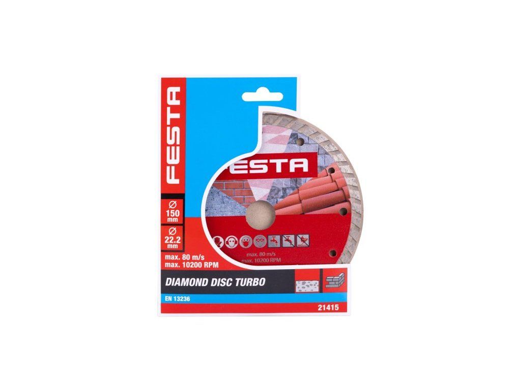 Diamantový kotouč FESTA, provedení : TURBO, kvalitní materiály i zpracování, speciální tvar diamantových segmentů i konstrukce a pevné uchycení k nosnému disku kotouče, vysoký obsah diamantového prachu, použití : pro suché i mokré řezání betonu, železobetonu, cihel, zdiva, kamene, balení : blistr s eurootvorem, rozměry : uvedeny v názvu výrobku.Dodatočné parametre