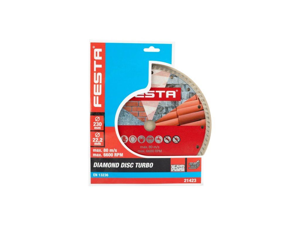 Diamantový kotouč FESTA, provedení : TURBO, kvalitní materiály i zpracování, speciální tvar diamantových segmentů i konstrukce a pevné uchycení k nosnému disku kotouče, vysoký obsah diamantového prachu, použití : pro suché i mokré řezání betonu, železobetonu, cihel, zdiva, kamene, balení : blistr s eurootvorem, rozměry : uvedeny v názvu výrobku.Dodatočné parametre