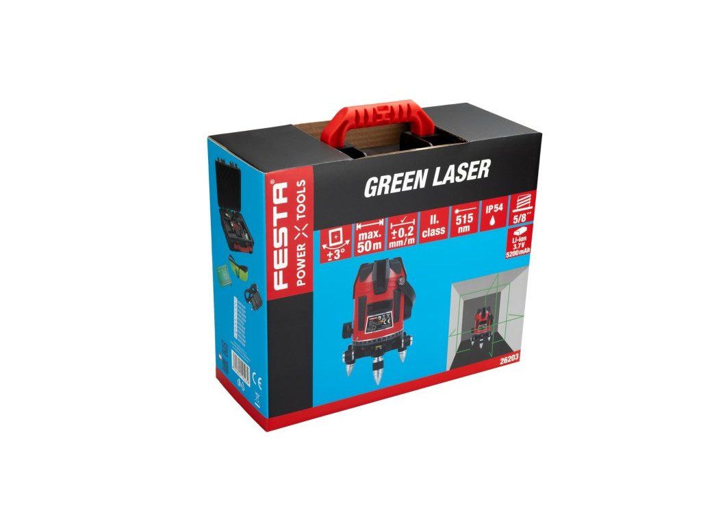<ul style="color: red"> <li type="square"><span style="color: black"> profesionáln křížový laser se zeleným paprskem</li> <li type="square"><span style="color: black"> 1x horizontální rovina + 4x vertikální rovina, funkce olovnice - promítání červeného bodu na podlahu (při použití na stativu, je nutné zvolit variantu s dutým závitem!)</li> <li type="square"><span style="color: black"> samonivelační rozsah <b>±3°</b>, přesnost <b>0,2 mm/m</b>, třída přesnosti II</li> <li type="square"><span style="color: black"> dosah ve vnitřních prostorech 30 m, <b>s laserovým přijímačem (26209) v pulzním režimu až 50 m</b></li> <li type="square"><span style="color: black"> 5/8" závit pro uchycení na stativ</li> <li type="square"><span style="color: black"> odolnost proti vodě a prachu <b>IP 54</b></li> <li type="square"><span style="color: black"> obsah balení : přepravní kufr, Li-ion baterie 2600 mAh, nabíječka, otočný ministativ v rozsahu 360°, cílová destička mm / inch, brýle</li> <li type="square"><span style="color: black"> náhradní Li - ion baterii lze objednat samostatně <a href="https://www.levior.cz/produkt/26206">26205</a></li> </ul>Dodatočné parametre