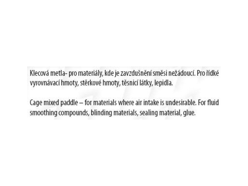 <ul style="color: red"> <li type="square"><span style="color: black"> míchadlo - metla kalich</li> <li type="square"><span style="color: black"> pozinkované</li> <li type="square"><span style="color: black"> průměr 100 mm, délka 500 mm</li> <li type="square"><span style="color: black"> stopka - <b>šestihran</b></li> <li type="square"><span style="color: black"> <b>použití :</b> klecová metla se používá pro materiály, kde je <b>zavzdušnění směsi nežádoucí</b> - pro řídké vyrovnávací hmoty, těsnící látky, lepidla na YTONG, atd.</li> </ul>Dodatočné parametre