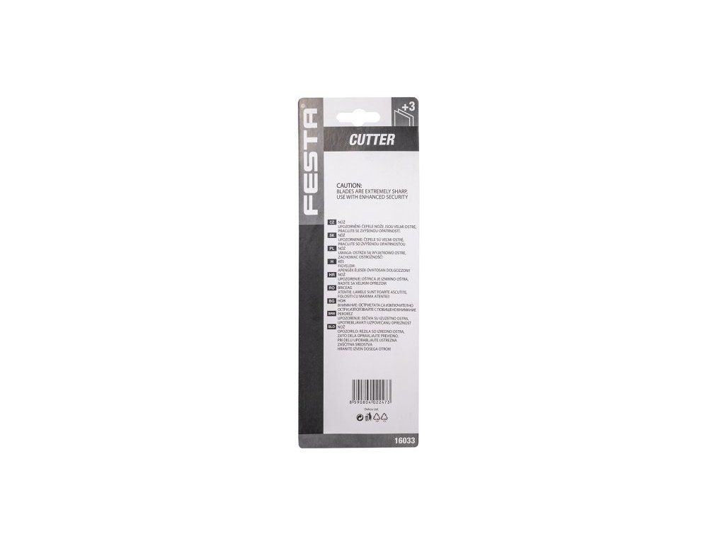 Kovový nůž s výsuvnou lichoběžníkovou čepelí, čepel uchycena uvnitř těla nože na posuvném jezdci, ergonomický tvar s pogumovanou rukojetí, výklopný zásovník na náhradní čepele.Dodatočné parametre