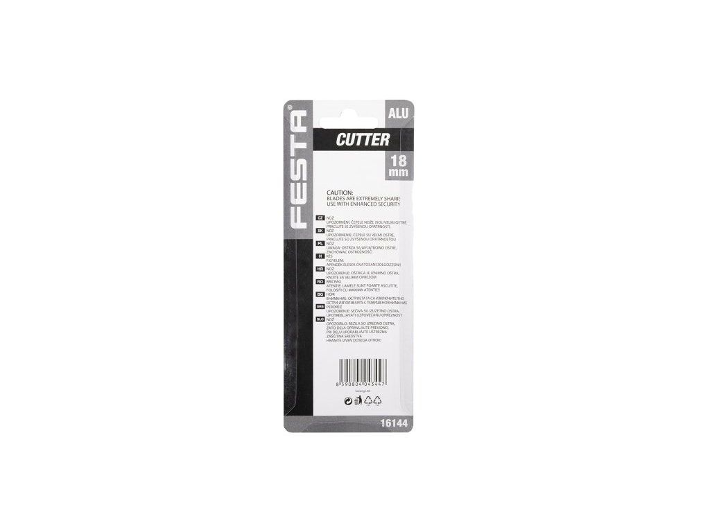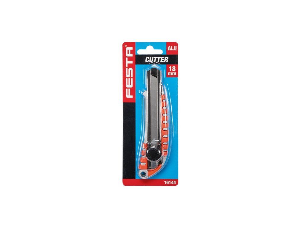 Odlamovací nůž FESTA 18mm, kvalitní materiály, celokovové tělo nože, protiskluzné plastové výstupky, kovová lišta, odolná šroubková aretace, do nože lze umístit až 2 náhradní břity, blistr.Dodatočné parametre