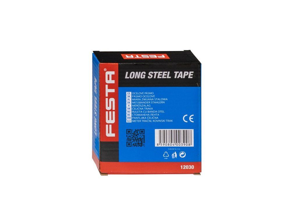 Kvalitní a přesné ocelové pásmo, kalená páska s očkem, CE certifikát - vhodné ke kalibraci, sklopná navíjecí ručka, poutko.