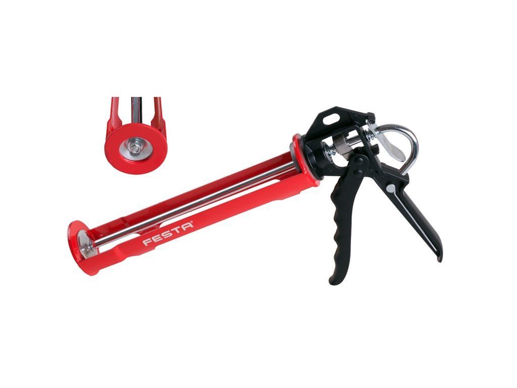 Vytlačovací pistole FESTA, PROFI, kvalitní zesílený a profilovaný ocelový rám i výtlačný a pojezdový mechanismus, uzavřené zakončení rámu pistole, kovová ergonomická rukojeť pro pohodlnou práci, profilované kovové bočnice, trn na čištění zaschlého tmelu ve špičce kartuše, použití : zesílený rám pro extra husté tmely - chemické kotvy a malty, pro vytláčení tmelů a lepidel v kartuších 310 ml.Dodatočné parametre
