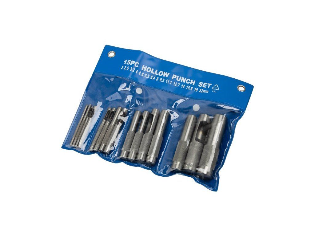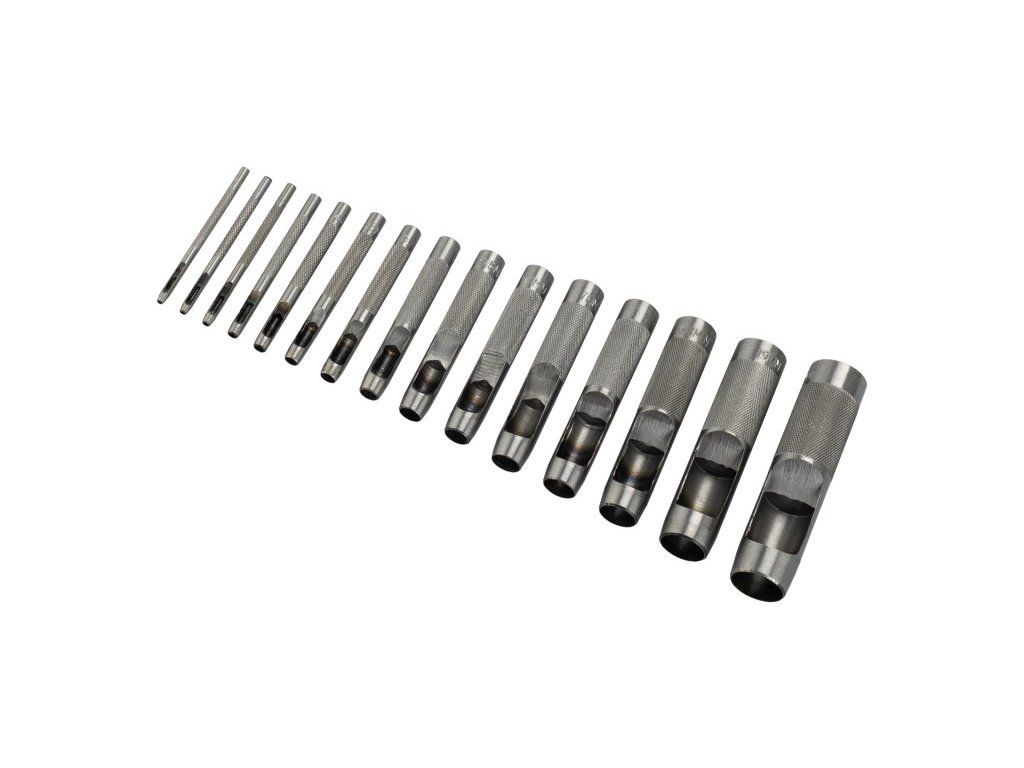 Ocelové děrovače na kůži. Děrovače jsou opatřeny bočním výhozem odpadu. Sada 15ks. Průměry děrovačů: 2mm, 2,5mm, 3,2mm, 4mm, 4,8mm, 5mm, 6,4mm, 8mm, 9,5mm, 11,1mm, 12,7mm, 14mm, 15,8mm, 19mm, 22mm.Dodatočné parametre