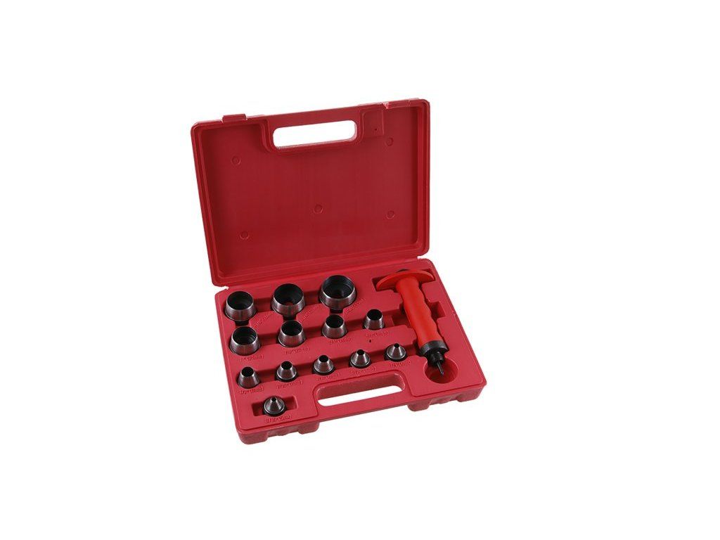 Průbojníky set 13 ks, materiál CrV. Kvalitní celokovové výsečníky v plastovém kufru, Průměr: 3, 4, 5, 6, 7, 8,10,11,13,16,19,22,25,28,32,35mm. Použití na kůži, lino, plasty.Dodatočné parametre
