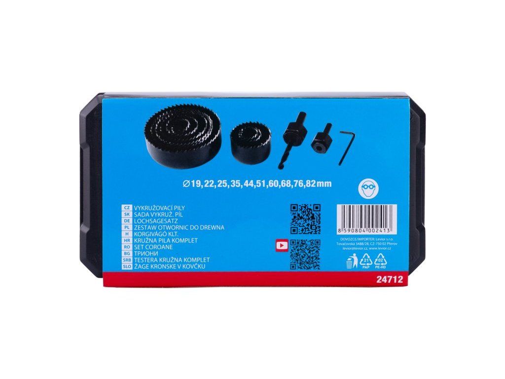 Sada vykružovacích pil 13ks do dřeva a sádrokartonu, průměr: 19, 22, 25, 35, 44, 51, 60, 68, 76, 82 mm + inbus + 2x hlavička. </ul> <ul style="color: red"> <li type="square"><a href="https://youtu.be/-BKqygACbys">Instruktážní video</a></li> </ul>Dodatočné parametre