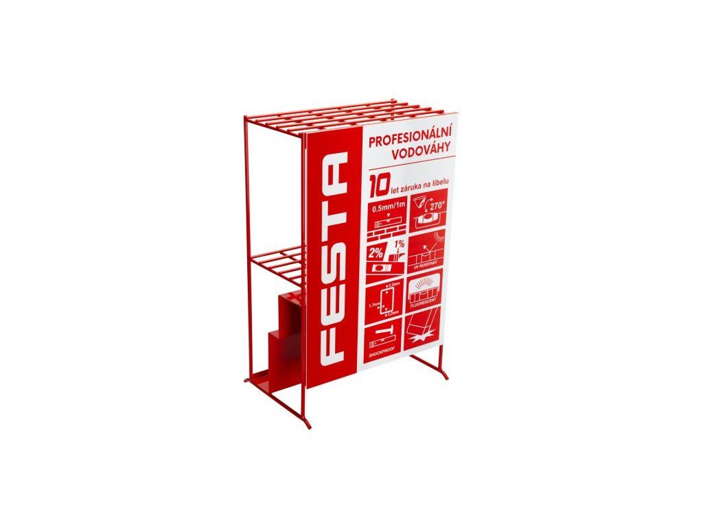 <ul style="color: red"> <li type="square"><span style="color: black"> stojan na vodováhy FESTA</li> <li type="square"><span style="color: black"> komstrukce stojanu umožňuje uložit 25 kusů vodováh různých délek</li> <li type="square"><span style="color: black"> <b>DOPORUČENÉ OSAZENÍ</b> : (délka vodováhy v cm) 40 - 2x, 60 - 4x, 80 - 3x, 100 - 4x, 120 - 3x, 150 - 2x, 180 - 3x, 200 - 4x</li> <li type="square"><span style="color: black"> rozměry - 40 x 62 x 25 cm </ul>Dodatočné parametre