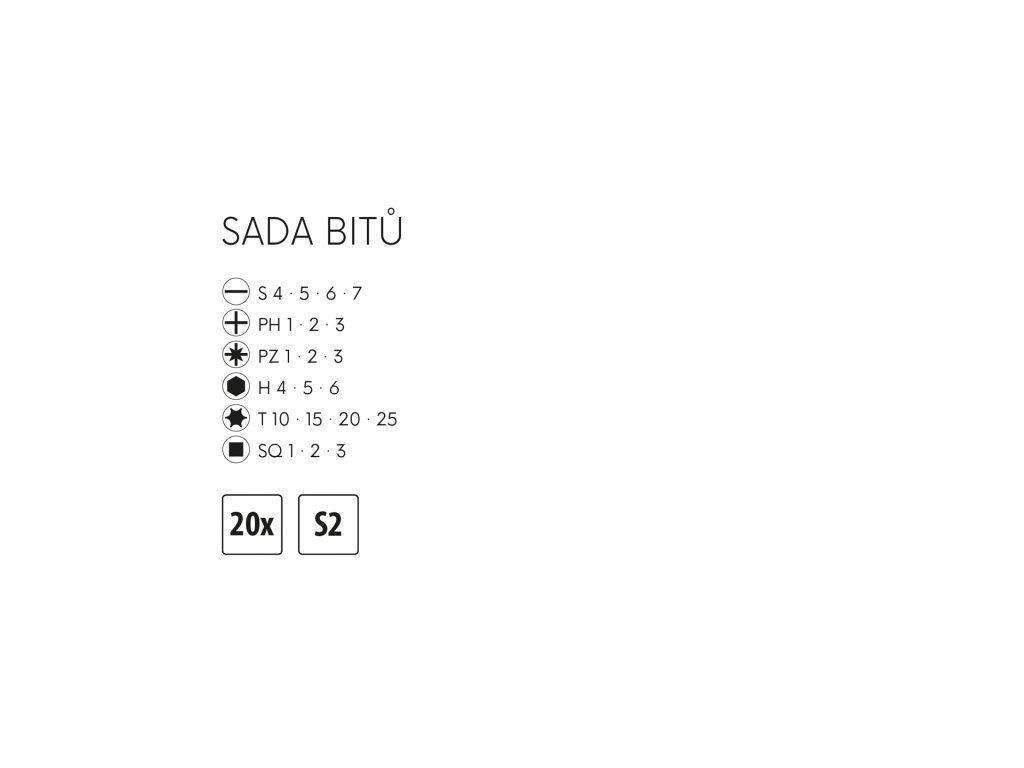 <ul style="color: red"> <li type="square"><span style="color: black"> sada bitů v praktickém plastovém zavíracím boxu</li> <li type="square"><span style="color: black"> bity z kvalitní <b>legované oceli S2</b></li> <li type="square"><span style="color: black"> obsah sady - <b>S</b> 4* 5 * 6, <b>PH</b> 1 * 2 * 3, <b>PZ</b> 1 * 2 * 3, <b>H 4 * 5 * 6, <b>T</b> 10 * 15 * 20 * 25, <b>SQ</b> 1* 2 * 3</li> <li type="square"><span style="color: black"> konstrukce krabičky umožňuje pohodlný přístup, rychlý výběr potřebného bitu a přehledné uložení</li> </ul>Dodatočné parametre