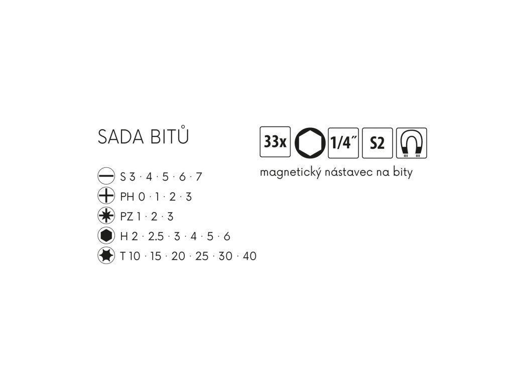 Sada bitů 33ks, S2 (5031), S, PZ, H, PH, T + magnetický nástavec.Dodatočné parametre