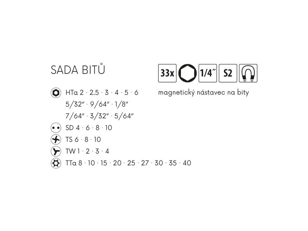 Sada bitů 33ks, S2 (5030), Hta, SD, TW, TS, Tta + magnetický nástavec.Dodatočné parametre