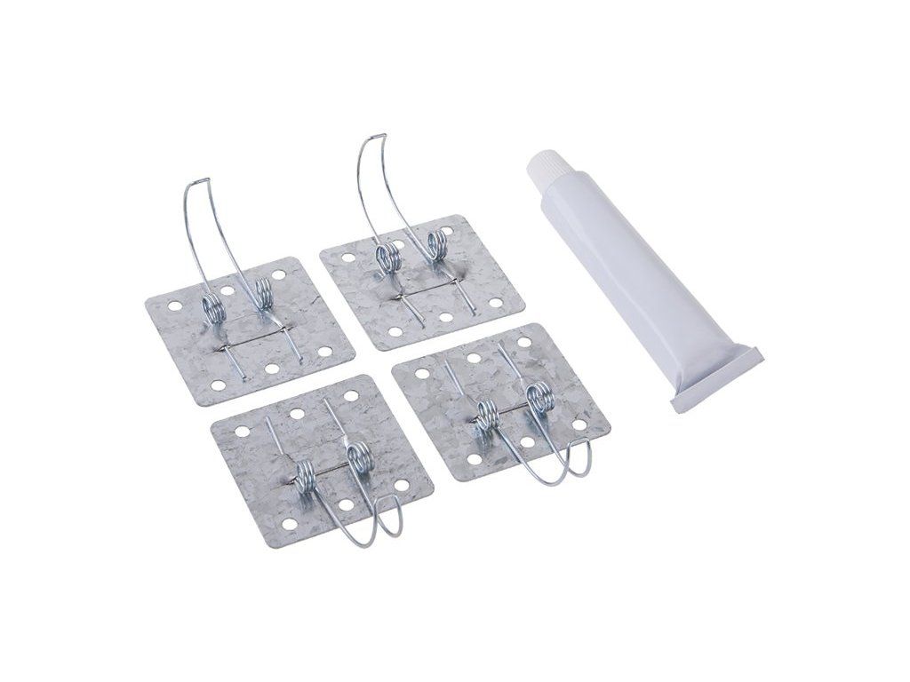 Svorky foxační - sada včetně silikonu, set svorek s pružnými pérky pro skryté prostory ve stavebnictví - zejména v kombinaci s obklady popř. sádrokartony, jako nenápadně ukryté přístupy k sifonům, uzávěrům, a jiným místům s nutností občasného přístupu, snadná aplikace silikonem nebo jiným lepidlem na kov, balení : blistr s eurootvorem.Dodatočné parametre