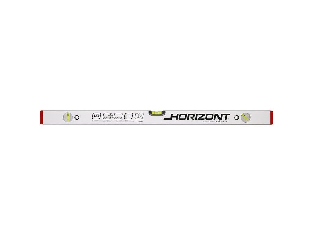 Horizont vodováha se třemi libelami, přesnost 0,5mm/m = 0,0285°, eloxovaný otěruvzdorný povrch, tloušťka stěny ALU profilu 1,5mm, kapalina v libelách je UV stabilizovaná a fluorescenční, horizontální optická libela - usnadňuje a zvyšuje přesnost měření, vodováha je odolná proti provozním nárazům, 10 let záruka na libely, KAŽDÝ KUS ELEKTRONICKY TESTOVÁN.Dodatočné parametre